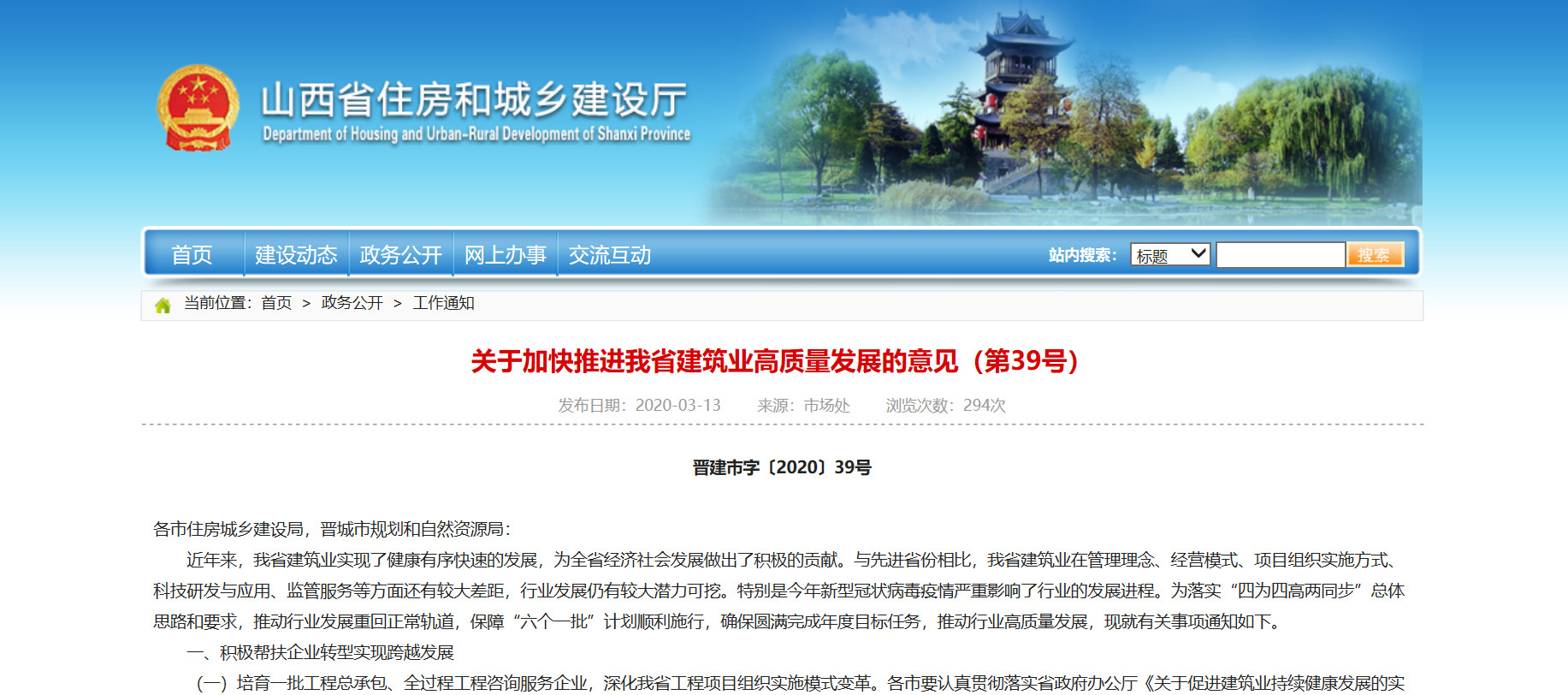2020年3月13日,山西省住房和城鄉(xiāng)建設(shè)廳發(fā)布了《關(guān)于加快推進(jìn)我省建筑業(yè)高質(zhì)量發(fā)展的意見 》晉建市字〔2020〕39號(hào),文中強(qiáng)調(diào):