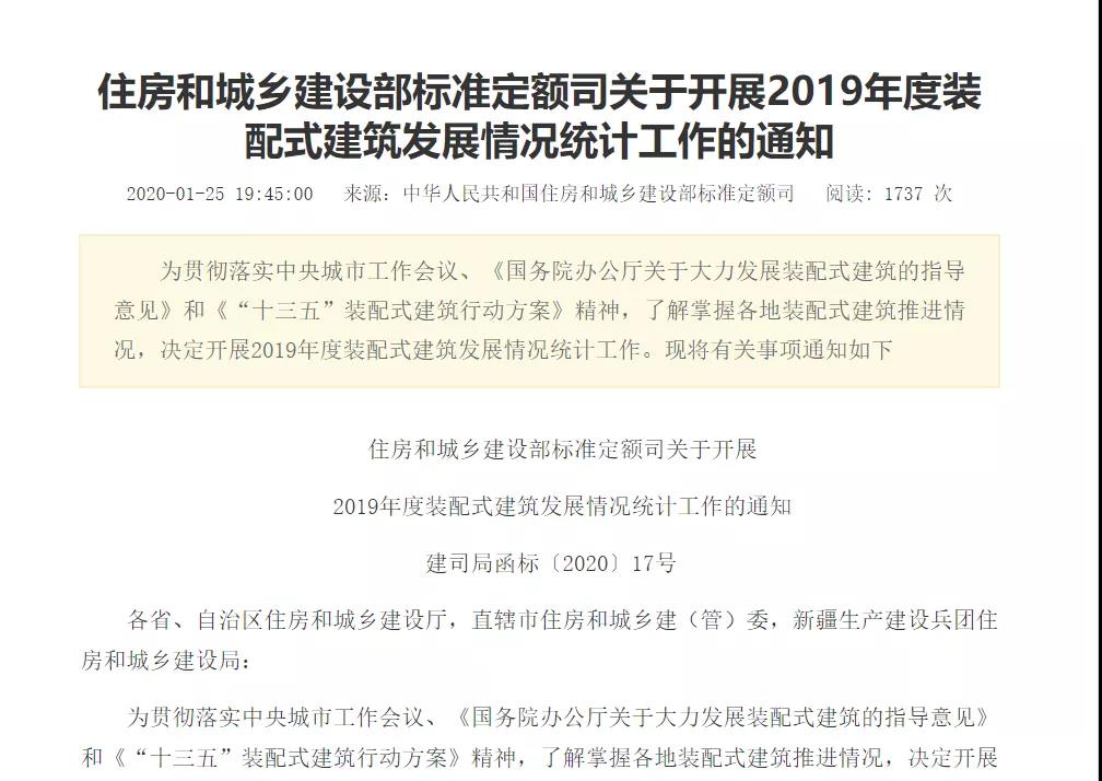 2020年1月25日,住房和城鄉(xiāng)建設(shè)部標準定額司關(guān)于開展2019年度裝配式建筑發(fā)展情況統(tǒng)計工作的通知,內(nèi)容強調(diào):